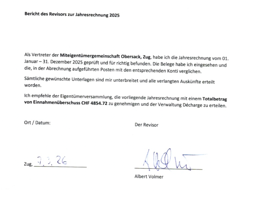 Bei unserer GV 2026 ist mir ein Programmpunkt verloren gegangen. Die Buchhaltungsdaten des Jahres 2025 wurden am 07.03.2026 von Albert Volmer geprüft. In seinem Revisionsbericht hat er die Empfehlung "Décharge" gegeben. Der Bericht wurde zuvor mit den Buchhaltungsdaten und Planungen für 2026 an alle Eigentümer verteilt. Wir danken Albert für die Prüfung und freuen uns, dass er auch im Jahr 2026 wieder als Revisor zur Verfügung steht. Wolfgang